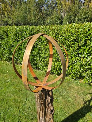 Garden Ord mounted on an aged macrocarpa sleeper. The orb is 500mm diameter and made from mild steel that has been "rusted". The sleeper is 900mm high and has a spike in the bottom to mount into the ground.